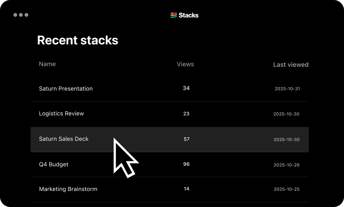 Everything you shared stays collected and accessible. No more “Can you send that deck?” follow-up messages. Just revisit the Stack, it’s all there, organized and already shared.