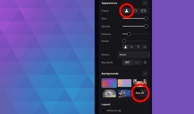 To remove your background and replace it with a virtual one in mmhmm, make sure you choose the silhouette frame, which cuts your shape out from your background. Then, choose a virtual background from our extensive catalog. We have hundreds of options, still and subtly moving, separated into categories: serious, fun, inspirational, abstract, holidays, and colors.