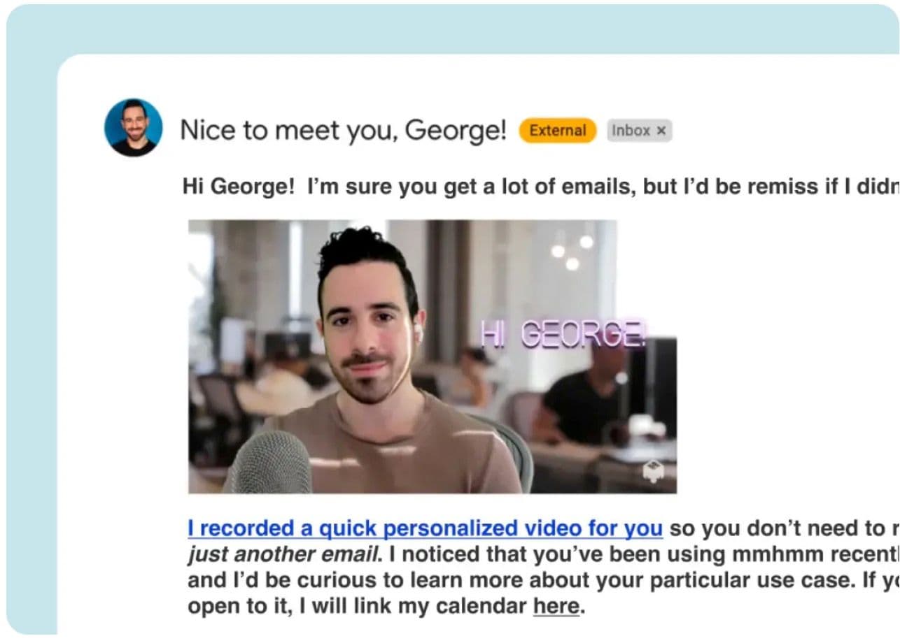A personalized video introduction immediately helps you stand out in a crowded inbox. Video grabs attention more effectively than plain text and signals to the prospect that you've put in extra effort to connect with them. This personal touch can make prospects more likely to engage with you over competitors.