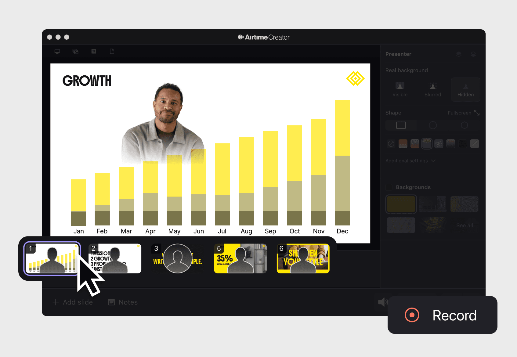 Record, edit, and share pitch-perfect presentations. Get to “yes” faster with clean, simple slides built around you and your energy.