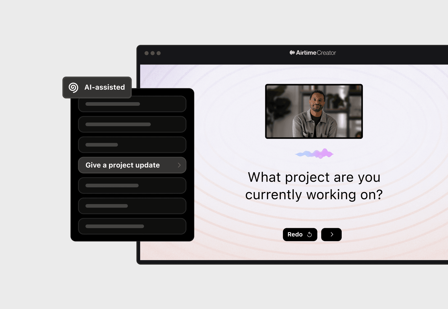 You don’t need a crew to produce a great video. Or a ton of effort. And with Airtime’s AI assistance, you don’t even need a script.