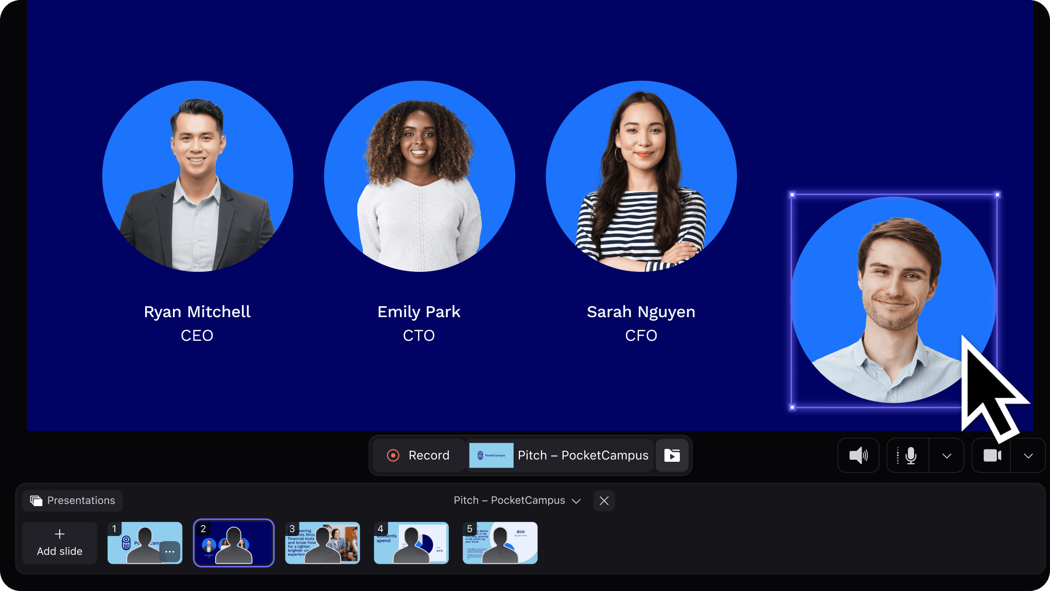 Boost your confidence by presenting with a partner (or up to ten people) on the same screen. Up the energy and flow by letting your partner drive the slides while you talk.